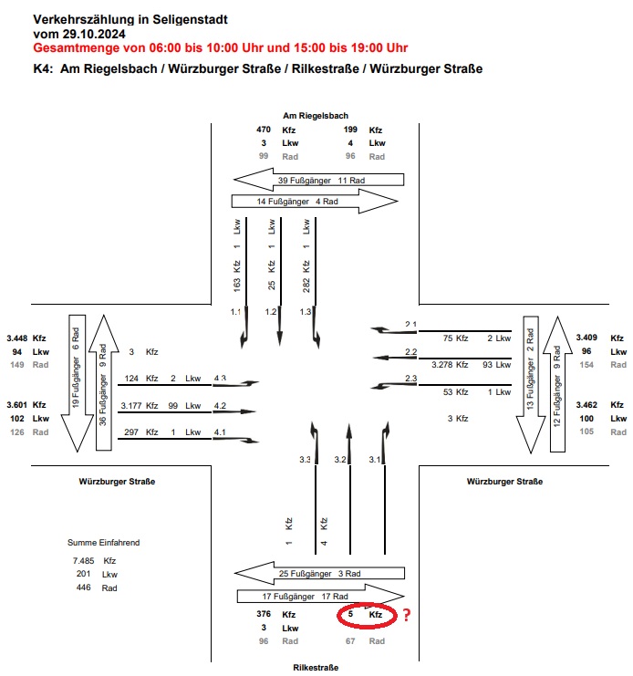 Ebenfalls erstaunlich: Beim Kreisel bei der Eisdiele Roma wurden angeblich bis zu 5 KfZ aus Richtung Rilkestraße gezählt (siehe Verkehrsgutachten – Anlage 1.4) obwohl die Rilkestraße bekanntlich eine Einbahnstraße ist und kein KfZ in dieser Richtung fahren darf.